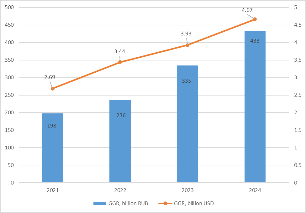 Market capacity (GGR) growth in rubles was 19% in 2022, 42% in 2023 and 29% in 2024. In dollars (converted at the average annual exchange rate), it was 28%, 14% and 19% respectively.